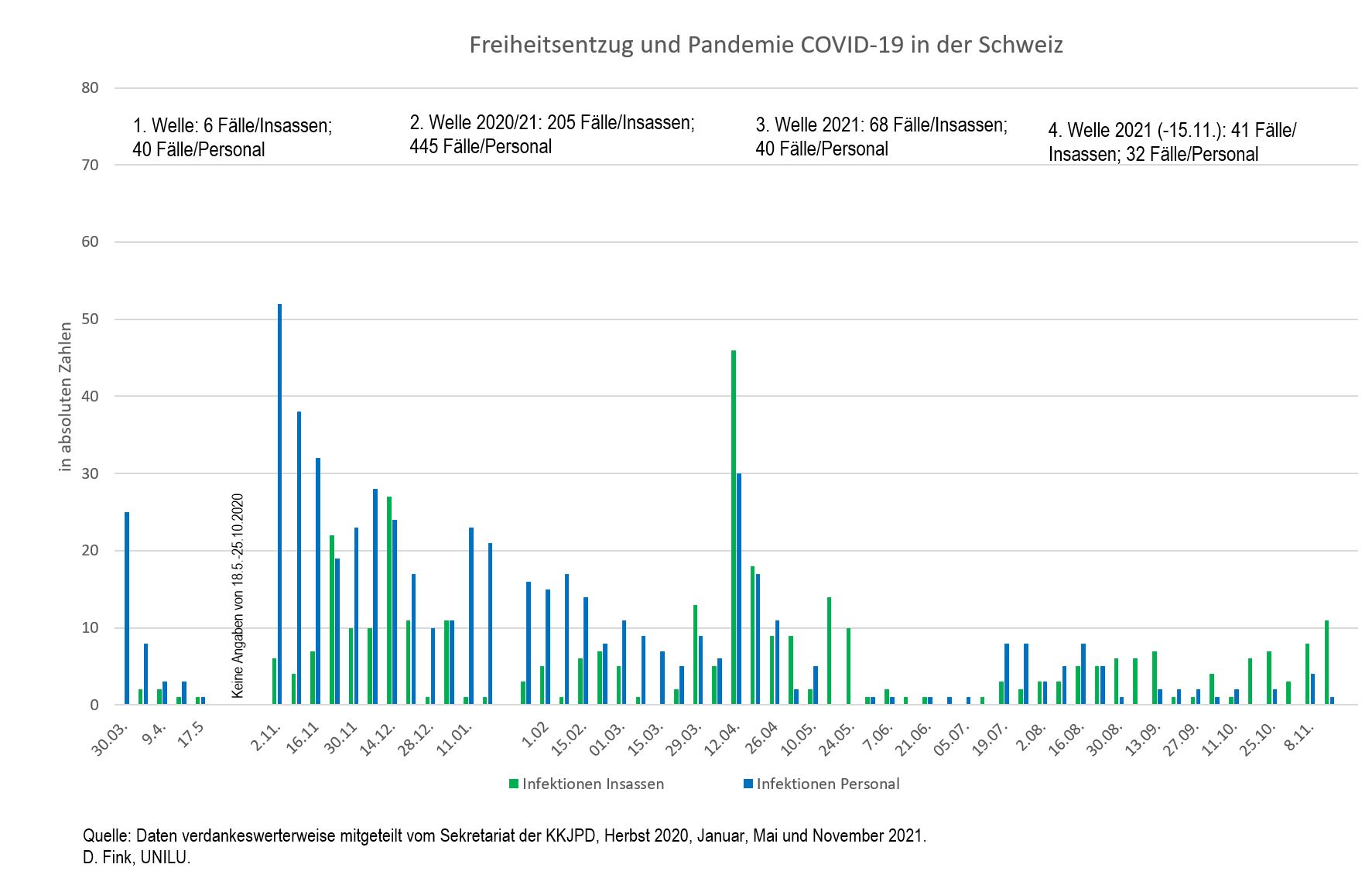 Im Freiheitsentzug findet wohl eine gesamtschweitzerische Datenerfassung der Infektionsfälle statt, allerdings weder der Spital- noch der Quarantänefälle oder der Impfungen. Vom 18.5. bis zum 25.10. 2020 fand keine Datenerhebung statt.