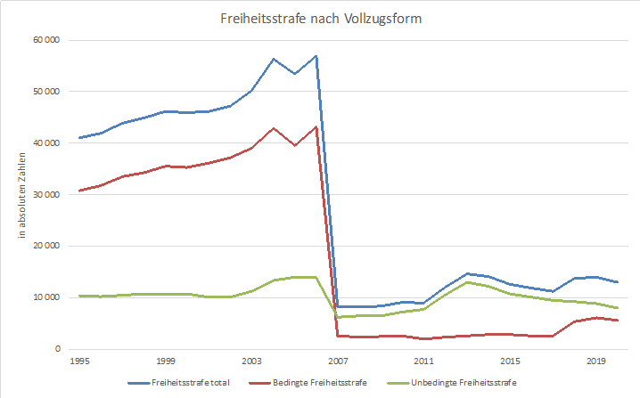 Zählte man kurz vor 2007 rund 55'000 jährlich ausgesprochene Freiheitsstrafen, die überwiegende Mehrheit in bedingter Form, sind sie nach der Revision auf unter 10'000 Fälle zurückgegangen. Während in den Folgejahren die Fallzahlen der unbedingten Strafe leicht zunahmen, blieben die bedingten in der Form von Strafen von 6 bis 24 Monaten stabil, mit rund 2500 Fällen.